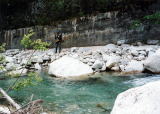 そろそろ昼食の時間になったので、流木を集めて焚き火をし、釣り上げたイワナを塩焼きにする。この美味さは別格で何物にも例え難い絶品の味だ。昼食を済ませた私たちは再び上流へ超大物を狙い向かうことにする。途中、難所を高巻で幾つか超えた所で、大きな地響きがした。見ると直径1〜2m程の岩が落ちてきたところであった。前日の雨で地盤がかなり緩んでいるのだろう。しかたなくここで納竿とする。