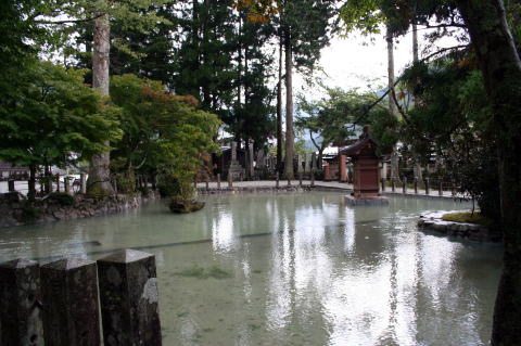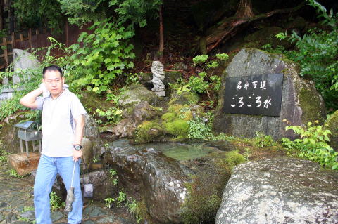 | チェックインを終えて、再び散策にでる。 次に向かったのは、名水百選「ごろごろ水」である。最近は水量がめっきりと少なくなったようで、見るとほんとうにちょろちょろrと申し訳なさそうにきれいな水を蓄えていた。 |