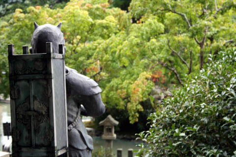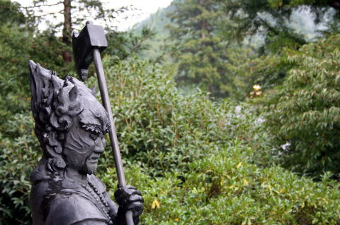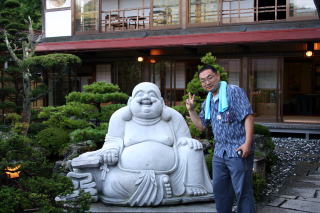 | 龍泉寺を散策後、「かりがね橋」へと向かった。龍泉寺と大原山にかけられたつり橋で、高さは50mもある。天気が良ければ洞川の町並みも一望できたと思うが、そぼ降る雨で霧に霞んでいた。引き返す途中では、「面不動鍾乳洞」への分かれ道に出たが、時間の都合で今回は諦めることにした。 そして、今回私たちが泊まる「光緑園西清」に行きチェックインした。 玄関には布袋様がどっしりと待ち受けていてくれ、建物のつくりも訪れるものを和ませてくれる静かなたたずまいである。 |