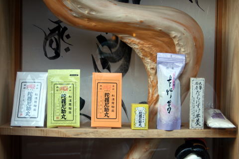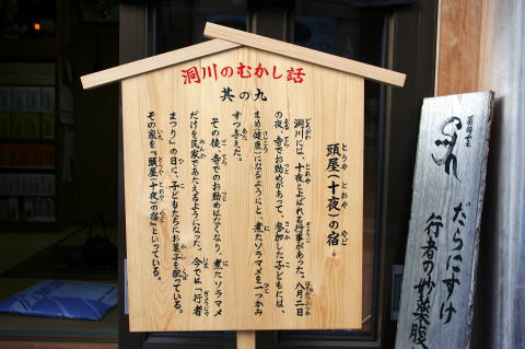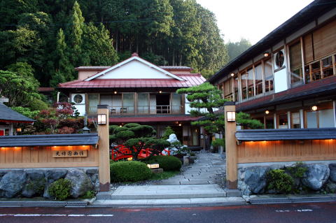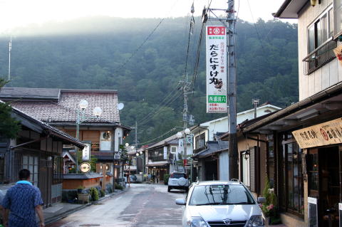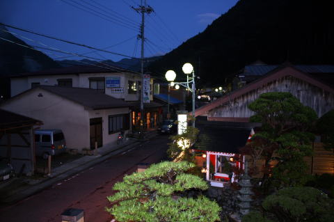 | 「ごろごろ水」や、「蟷螂窟(とうろうのいわや)」などを見て、ゆっくりと宿に戻る途中では雨もすっかり上がってきた。 宿の周りには「陀羅尼助」(だらにすけ)の看板があちこちに見られる。胃薬のようで、和漢の一種と思えばいいと思う。たぶん、御岳の「百草丸」に近いのかな? 宿に到着後は気持ちのいい温泉に浸かり、美味しい料理に舌鼓を打ち、美味い酒を飲みました。 また、温泉街ということで、夜の街も散策に出た。射的もあったとうわさを聞いたが、閉店したあとであった。 だが、ライトアップされた「龍泉寺」は、その壮健な姿を昼間とは違った姿で見せてくれ感動した。 |