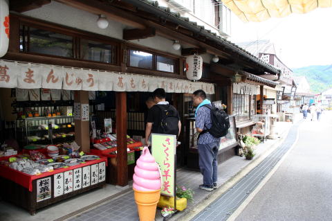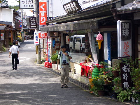 | もちろん堂内は撮影禁止なので写真はありませんが、見上げるような蔵王権現像には身も引き締まる思いがしました。それでも、蔵王堂のありがたい説明を聞いているのにも関わらず、居眠りをしている輩もおり少し残念です。 この後、旅館や土産物屋が並ぶ道を歩き「竹林院へと向かいました。 |