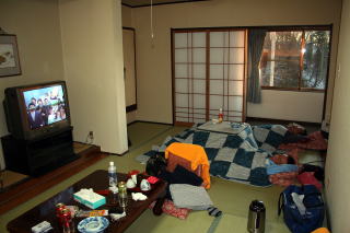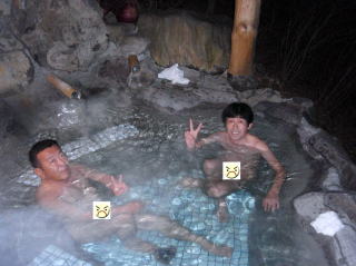 | 夕食後は、年末恒例の某NHKの「紅白歌合戦」をみんなで見たが、最近の唄はさっぱりわからんと嘆く3人であった。だが最後まで真剣に見たのは初めてかも知れない。 コリ症のとっちんはマッサージを頼んで、体中をほぐしてもらっている。除夜の鐘を聞いた後は、館内にある「岩風呂」に入って、朝までグッスリでした。 |