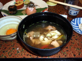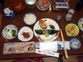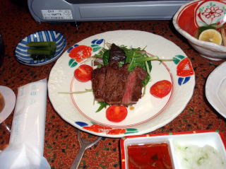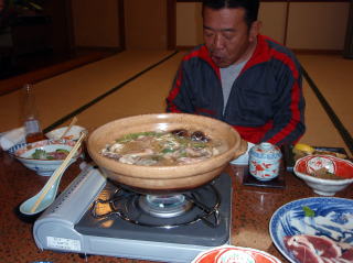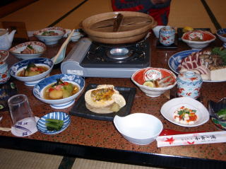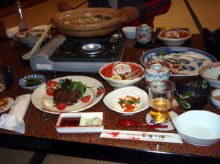 | しばらく周りを散策しながら写真を撮った後は、体もかなり冷えてきたので旅館に戻った。 二人とも気持ち良さそうに寝ていたので、今度は、館内の散策をした。 日帰り入浴用の受付横には、ここに訪れた芸能人などの写真や、動物の剥製が飾られていた。ゲームコーナーや、カラオケルームもあったが利用者はいなかった。 夕食までには少し時間もあったので、貸切風呂を予約して入り、冷えた体を温めた。 夕方6時半になり、夕食の時間となった。食事会場では我々を含めて3組だったので静かな夕食時間となった。 鴨鍋が真ん中に置かれ、豪華さをかもし出している。刺身料理は「鯉の洗い」が付いていたが、つかさくんだけは鶏肉料理になっていた。そしてしばらくして信州牛のヒレステーキも登場し、最後は松茸の入った五目御飯で満腹状態となりました。 |