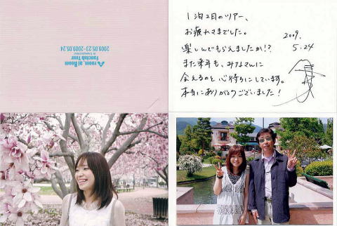 | FCツアーに今回2回目の参加です。昨年は参加できなかったので今回は気合入ってます。 名古屋組は、朝6時50分に名古屋駅集合となっているので、4時半に家を出て始発の電車に乗り無事出発した。 出発すると、ビデオが流されて川嶋あいさんからの挨拶がありました。そしてFC用のVTRが流され、内容は各地のキャンペーンの様子や、ニューヨークでの桜祭りの映像、そして新曲「大丈夫だよ」のメイキングでした。 東名高速経由で「河口湖」を目指します。ところが途中の「清水IC」手前で事故渋滞があり、抜けるのに一時間近く掛ってしましまい、結局このVTRは3回も見ました。 「富士川SA」で昼食をとり、最初の目的地「UKAI河口湖オルゴールの森」に到着しました。 東京組も渋滞で少し遅れているようで、ツーショット写真は名古屋組からとなりました。中に入ると川嶋あいさんも登場してきて屋外での撮影となった。 どんなポーズで決めようかと昨晩から寝ないで考えていたのに、係員から「今日のポーズはピースサインのみでお願いします」だって・・・。全員から「えーっ!?」という声が上がった。 私が「何で?」と代表して質問すると、 「今回はLove&ピース!っていうテーマでお願いします」との事。 「60年代じゃん」っていうと係りの人は笑っていましたが、例の豚インフルの影響もあるのかなと思いました。 私は4番目となりましたが、とにかく緊張しちゃいました。写真を撮った後は握手をしてもらい大感激でした。 |