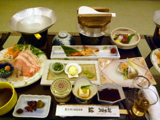 | 今回の宿泊地は、3箇所に分かれていて、 「富士緑の休暇村」 「湖南荘」 「ウインヒルレイクホテル」から選べましたが、露天風呂のある「湖南荘」にしました。到着すると建物も改修直後のようでとても綺麗でした。 東京組の方達との相部屋だったんですが、同じファン同士なので話が合うのは当然で、中にはノートPC持参の方もいてビックリです。 挨拶もそこそこに、さっそく風呂に入って夕食の時間までのんびりしました。 食事では、この後にライブが控えているのでビールは一本にしときました。そして、18時30分頃に再びバスが迎えに来て、ライブ会場の「オルゴールの森」に向かいました。 |