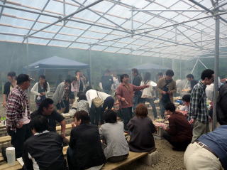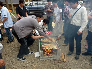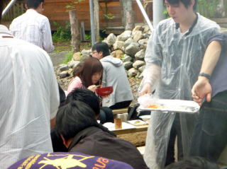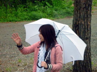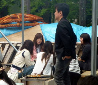 | バスで「野外料理体験」会場へ移動した。 「清水国明」さんが経営している「森と湖の楽園」という所で、野外料理体験が出来るそうです。要はバーベキュー会場です。 宝探しのチーム毎に分かれてさっそくバーベキューを開始すると、煙があちこちで立ち始め、煙いのなんのって、目が開けてられませんでした。 やがて川嶋あいさんも登場して各箇所を見た後に、関係者用のテーブルで食事を始めました。周りの人達もあいさんが気になって焼肉どころじゃないっていう感じでした。私もキョロキョロしながらでもしっかりとおかわりして食べました。 あいさんのテーブルまで行って話しをしている人もいましたが、ゆっくりと食事をして欲しいので、私は遠くから眺めるだけにしました。? 食事後に、「総合案内所」へお手洗いに行くと、休憩所のテーブルで川嶋あいさんがスタッフの方達と打合せをしているのを見つけちゃいました。でもあまりジロジロ見ていても申し訳ないと思い、ゆっくりと横目で見ながら通り過ぎました。 2〜3回お手洗いには行ったかな?(^ロ^) |