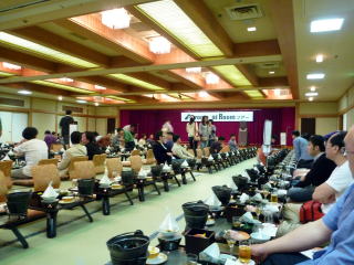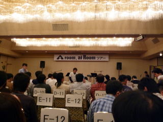 | 夕食会場は200名も入れる大宴会場でした。くじ引きで席は決まっていたのだが後ろの方で残念だった。 あいちゃんの挨拶から始まり、みんなで食事をしているとなんと「あずあず」の歌の披露が始まった。これは2年越しの実現である。しかもかなり旨い。「明日への扉」とアンコールで「「My Love」の2曲を歌いました。 食事後は隣のライブ会場へ移動し、ライブやゲームをして楽しい一時を過ごしました。 |