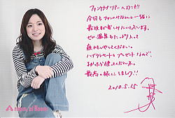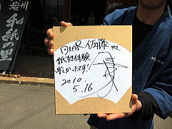 | 川嶋あいさんの弾き語りとながじいのギターで全8曲を歌ってくれました。時間の都合でアンコールは無かった。 以下がセットリストです。 1. 大丈夫だよ 【MC】なかじぃと夫婦漫才みたいな小芝居 2. 君に・・・・・ 3. 春の夢 4. Eggheart 【MC】デュエット希望者の“川嶋じゃんけん” 5. 見えない翼 (参加者とデュエット) 6. どんなときも 7. 足跡 8. 飛べない鳥 なかじぃとの小芝居は2つのネタで、一つ目は今回初めてなかじぃがサポートで来たけど、その理由がツーリング目的だったというやりとりでした。2つ目は、川嶋あいさんは今までなかじぃから名前で呼ばれたことがないけど、なかじぃは名前で呼ぶのが 恥ずかしいとのことでニックネームを決めることになり、川嶋あいさんのブログ「ひとこと」に描かれているカエルにちなんで「ケロちゃん」に決まりました。川嶋あいさんとなかじぃの小芝居は回を重ねるごとに少しずつ進化していて面白かったです。 なかじぃの棒読みな感じのセリフも笑いを誘いました。「見えない翼」は参加者とのデュエットで、希望者が“川嶋じゃんけん”をして勝者1名と一緒に歌いました。 “川嶋じゃんけん”は3回行なわれ、賞品は川嶋あいさんと電話ができる権利、川嶋あいさんが愛用していたBaby-G腕時計、ファンクラブ会報の全セット+柄が白いサンプル版のバンダナでした。また、途中まで勝ち残った40名ぐらいの方が川嶋あいさんの直筆サイン入りの「春の夢」と「24/24」のポスター、店頭用POP、ツアーで川嶋あいさんが着用していた08年と09年のリストバンドをゲットしていました。自分は3年連続の敗退でグッズをゲットできませんでした… 2日目は、「信州立岩和紙の里」に行って紙すき体験のうちわ作りを行いました。 最初に掛りの人から説明を受けたのですが、しどろもどろであいちゃんのことも知らないと言ってました。 みんなで作業をしているとあいちゃんが各箇所を廻ってきました。私の位置ははしっこだったので作成中の絵を見てくれ感心してくれました。空いたスペースに何を書いたらいいのか聞いたら「夕陽を書いたら?」って気軽に答えてくれました。あとで考えたらこんなに普通にあいちゃんと会話できたなんて感激ものですよね。 もちろんその時も嬉しくて作品を仕上げるどころじゃなかったので、うまく書けませんでした。 でも、この「うちわ」じは完成後にあいちゃんがサインをして送り届けて貰えるようで楽しみです。 |
