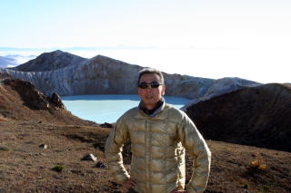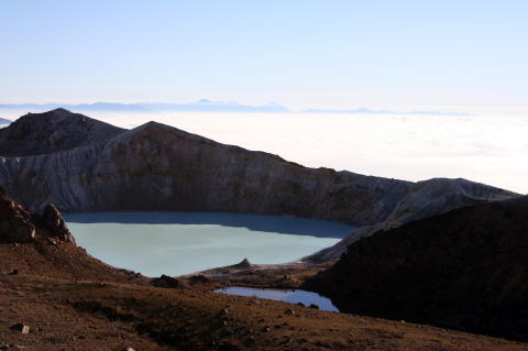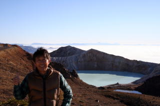 | そうこうするうちにあっという間に白根山に到着。 まだ7時過ぎとあって人も少なく、駐車場も空いている。駐車場の管理人もまだ来ていないので空いた場所に車を止めた。 通常の登山道から湯釜に向かおうとしたが、ロープが張られて入山できないようだ。残念! あとで係員に聞いたところ、ここ2年ほどはいつ噴出してもおかしくない状況らしく、危険な状態らしい。 しかたかなく、少し離れた登山口から上ることにした。 登り初めてからすぐに頭痛がしてきた。標高2,160mもあり高山病?少し寝不足もあるが軟弱になってきたものだ。 それでも何とか展望台のある所までは20分ほどで到着した。湯釜からは少しはなれているがそれでも綺麗なエメラルドグリーン色を堪能できた。 |