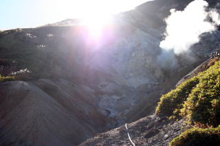 | この後、草津温泉の行こうか軽井沢方面に足を延ばそうか迷ったが、とりあえず近くの「万座温泉」に向かった。 来た道を少し戻るとすぐに左手に見えてきた。 温泉街を抜けると、湯けむりが噴出しているのが見えたので近くまで行き写真だけ撮った。 |