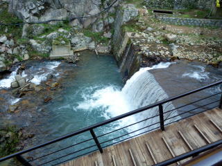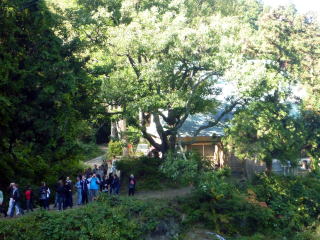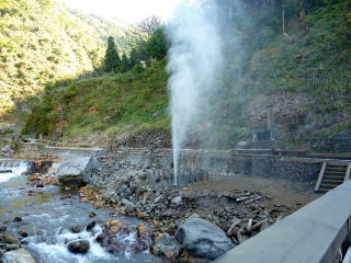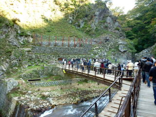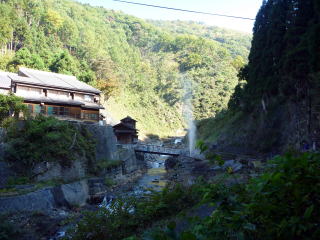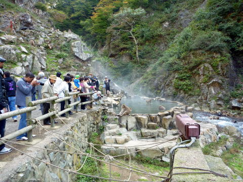 | 時間もまだ8時半、今度は「地獄谷温泉」へ向かった。 朝登ってきた道をどんどん下って行きます。紅葉の時期ともあってこれから登ってくる車はたくさんだ。 湯田中温泉を右折し、温泉街を過ぎると急に道が細くなり、車一台分の巾しかない。 ちょっと不安になりながらも、あと2kmの看板を頼りに車を進めると、運悪く対向車と遭遇。 なんとかぎりぎりですれ違うことができたが、対向車の運転手が窓を開け、「今日は猿はお留守でござる」と言っていた。 まあ、温泉に浸かることができればいいかなと思い行ってみた。行き止まりには駐車場があり、500円を支払う。 風呂の支度をして山道を登って行くと対岸に温泉宿が見えた。するとそこから何十人もの外人の団体が出てくるのが見え、えっ!あんなたくさんの人が一度に風呂に入っていたんか?と不思議に思えたが、対岸ではなくすぐに別の宿が見えてきて安心した。 ここでもお風呂の代金を500円払い何とか温泉に入ることができた。だが、露天風呂が工事中ではいることができなくて残念であった。温泉は非常に熱いが先客が3人いて、その人達が水をいれていたので丁度いい湯加減であった。また、管理人の話では今、猿を迎えに行っているのでもうじき来るらしいとの事だった。 のんびり温泉を楽しんだあとは、今日はお留守という「野猿公苑」を一応の覗いてみた。 先ほどの外人客の団体で入り口は列が出来ている。どうやら猿が来ているらしく、入苑料の500円を払って入ってみた。 いるわいるわ、えてこと外人の団体。それでも川沿いの道を進んでゆくと湯けむりが上がっているのが見え、人だかりが出来ている場所には露天風呂があり、「えてこ」の入浴を眺めた。 帰りに判ったことであるが、外人の団体客が登ってきた道は、我々が来た道とは別の道があり、観光バスも止められる無料駐車場があるとの事。但し、そこからは30分ほど歩いてくるらしいので良かったのかどうかは別である。 |