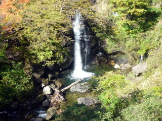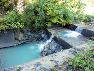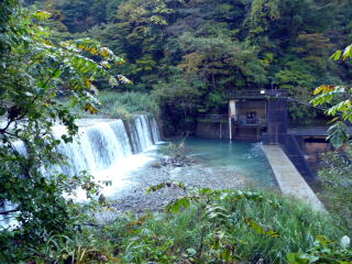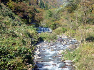 | 支流の「観音谷」の上流へに行こうとしたら、上流へ向かうミキサー車を発見し断念した。 本流へ戻り「桧谷」沿いの道へ指しかかると急に坂道となってきた。 この時、シエラのエンジンが機嫌を損ね息継ぎをしはじめた。坂の上を見ると何十台もの車がすれ違い出来ずに立ち往生しているのが見えたので、Uターンしたのであった。 途中でこの「桧谷」を覗くと綺麗な滝を見つけた。 |