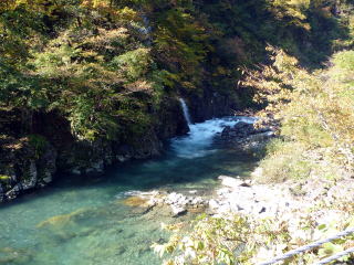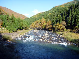| 今年中にどうしても見ておきたかった「打波川」へ紅葉見物を兼ねて行ってきた。 早朝5時に出発し、途中の九頭竜の道の駅で弁当を購入し、打波へと向かった。 国道158号線を「勝原」で右折すると、道路は急に狭くなってきた。道路から見える打波川は川幅も広くこの時期にしては水量もかなり多いのかなと思うが初めての川なのでさだかではない。 右手に支流が現れたので車を乗り入れポイントを確認する。 「谷山川」であり堰堤や落込みがあり、覗いてみたが小魚も走らない。寒いからなのか、それともお留守かな。 |