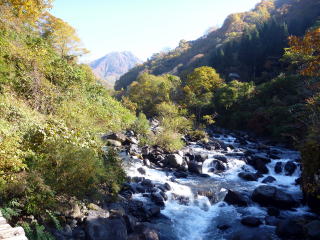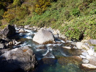 | お腹も空いてきたので、お弁当を食べられる場所をさがしながら再び「鳩ヶ湯温泉」まで戻り休憩。 途中の支流で河原に降りて昼食とした。 この後、「平成の湯」でのんびりと紅葉を眺めながら露天風呂に浸かった。 |