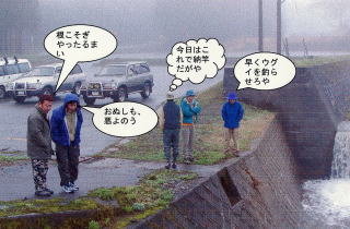 | 武ちゃんは、ここで今年最初の一匹を見事に釣り上げました。 遅ちゃんは、上流で支流を発見し真っ先に向かったがメインのポイントを前にして、その手前で根係りしてしまい、ギャラリーからブーイングを浴びる。しかも、最後には誰とは言えないが石まで投げ付ける人まで出てきた。遅ちゃん人生最大のピンチ!!。 しかし、気を取り直した遅ちゃんは、ついでに仕掛けも直して、見事にイワナを釣り上げ、やんやの喝采を浴びたのでした。(サイズは・・・・。) |