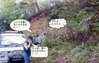 | 移動途中で、先導役のとっちんが眠りに落ちて、ひろくんに運転を変ったらしいが、道がよく判らなかったようであらぬ方向に行きだした。すぐ後ろを走っていたつかさくんは、自慢の「人間ナビ」の威力を発揮し、いつものスーパー農道に戻ることができた。また、つかさんくんは野生の感が働いたのか、突然入った駐車場の脇で立ちション中に、タラの芽を発見し今晩のおかずをゲットしたのである。 遅ちゃん、桐やん組のデリカ号は、近くのお墓に車ごと迷い込んで、奇声を上げながらバックしている。ほんとうによく判らない人たちである。 |