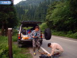 | 今回は仕事の都合上、参加したのはとっちん、ひろくん、私の三人となりました。参加出来なかったメンバーからは是非とも尺物を釣ってきてとエールを受けました。(ホントカイナ) 5月24日(土)地元の会合が夜8時半に終わったので、既に荷物を車に積み込んであったので、そのまま出発し、名古屋インターから高速を走り、春日井インターで降りてとっちん家に到着したのは9時半頃だった。 弟のひろくんがまだ到着してなかったので、家にお邪魔してコーヒーをご馳走になりしばらく待ちました。そして、ひろくんが到着して車に荷物を積み込んで出発したのは11時を回っていた。 途中、郡上八幡でエサを購入し、富山へ一直線。高山市内を過ぎて神岡町を走っている頃に眠気が襲ってきて後部座席でウトウトしていると、何やら車内が殺気立っている気配を感じた。それにも益して、いやに車が揺れるなあと思ったら大バトル中だったのだ。どうも工事信号を無視して行った車を追っかけているようだった。 それでも私は眠気には勝てず、揺れる車の中で再び眠りに落ちていったのでした。その後、富山に着いたのがいやに早かったのは言うまでもない。 |