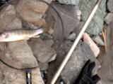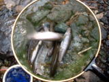 | この後、3人で粘ってみたが結局諦めて下流へ移動した。今回はとっちんが途中の支流へ入りたいとの事だったので、水量が心配だが行って見ることにした。途中のポイントで竿を出すと23〜5センチのイワナが続けて掛かり、チビイワナも含めると5匹程釣れましたが、2匹ほど今晩のおかず用にキープしようとしたが、袋に水を入れようとした時にお帰りになられてしまいました。まあ、次回の時までに大きくなってくれればいいと思いました。 |