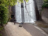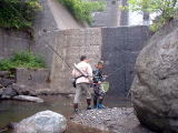 | 昨年、とっちんと武ちゃんが来て尺物を上げた堰堤へは、川を渡らなくてはならないが、水量が多くて少しためらいましたが、何とか渡ることができた。そして早速、とっちんとひろくんが交代で竿を出したが大物がでることはなかった。しかし、塩焼きサイズは7〜8匹程でました。 次に、堰堤の上を目指して山道を登って上から覗いて見たが、水量がなくて少しガックリ。でも、それでもめげないのが根こそぎ隊。木の枝にロープを括り付けて降りて行ったとっちん。僅かな水量の中からしっかりと塩焼きサイズのイワナを釣り上げた。その後、とてもいないだろうと思われた水溜りでも一匹を追加し、最後にポイントに入り足でかき回すという徹底ぶり、恐るべし根こそぎ隊。 でも、釣った魚は写真を撮った後に、根こそぎコンビに見つからないように少しリリースしときました。 時間は8時半頃であったが、ここで青海川は終りとし、前回行った「田海川」へ行くことにした。 |