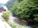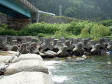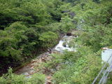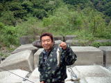 | 大きなブロックが並んでおり、その間を水が流れ落ちている。最初に左側を攻めると18センチ程のイワナが3匹続けて釣れてきた。そのあと、いい引きだなあと思ったら、24センチ程であったが幅広でとても綺麗なヤマメが釣れてきた。 橋の上を見ると、さっきまで上で覗いていたとっちん達が、私がヤマメを釣ったのを見てあっという間に下りてきた。 |