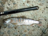 | 早速降りてきたとっちんの話では、何かもっと大きなのが見えたぞといってルアーで右側から釣り始めた。 すると、いきなり私と同サイズのヤマメをゲットしたのでした。 |