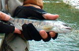 | しかし、この時とっちんは、とんでもない奴を目撃してしまったのである。この釣ったヤマメのあとに、とてつもない大物が追っていたのであった。最初は川鯉かなと思ったらしいのですが、魚体を反転して戻っていった時に初めてサクラマスだと気が付いたようで、そのサイズは優に60センチを超えていたようである。 ほんとかいなと、半信半疑で橋上に戻り、上から覗いてみた。すると、ものすごくでかい奴がはっきりと見え、しかも一匹だけではなく3匹は確認できた。他の2匹は60センチはないが、それでも40センチは遥かにオーバーしており、小魚でも追っているのか回遊をしている。 とっちんがルアーで攻めるが、2〜3回ゴツゴツとしたが、全然見向きもしないとの事。でも上から見ている時にサクラマスがいきなりジャンプしたのは迫力満点であった。 道路下の空き地にテントを設営して粘るかという話まで出たが、3時間以上粘ってもウグイが出ただけで、時間も4時を過ぎたので、結局諦めて常願寺川へ移動しようと黒部方面へ向かったのでした。 |