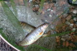 | 次に我々は黒部市に向かい、小川川の支流の様子を覗いてみた。 やはり、雑草がかなり伸びており車も入り難い。また、川は水量も少なくて前回釣った場所も水が流れておらず、竿も出さずに早々と後にした。 このあと、国道8号線に出て、国道沿いから入れる川を探索した。最初に行った川で、橋の上から様子を覗くと魚が群れているのが見えたが魚体を反転してキラリと光って見えるのはウグイだと思われる。まあ、何か釣れるかも知れないと思い竿を出してみた。 泡の中に仕掛けを投入すると、直ぐにアタリがあった。しかも、ウグイのアタリではなかったので慎重に上げると綺麗なヤマメであり、サイズも25センチ程あり、とてもビックリした。 つかさくんはウグイを釣って苦笑いであるが、このあともう一度私が竿を出すと18センチ程のイワナが釣れた。 |