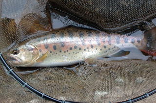 | 【今回の釣果】 日時: 2003年6月14日(土) 天気: 曇り時々雨 場所: 富山県 早月川支流、片貝川、他 釣果:イワナ・ヤマメ 16〜25センチ 15匹くらい(二人の釣果) 尚、本日は食べる予定がなかったので釣った魚は全てリリースとなりました。(^_^) |