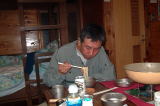 | 「どやまらんど」に到着し、管理棟に行くと、「やあ、釣れましたか?」と、声をかけてくれた。我々がいつも釣りで来ていることを知ってみえるので、すでに顔なじみとなってしまっている。そして、昨日まで全然雨が降っていないと教えてくれました。 荷物を降ろしたあと「アスパラ・ベーコン炒めのニンニク風味」を作り、缶ビールで乾杯した。休憩後、「明日山荘」の風呂に行ったのが、雨の露天風呂もこれまた風流であった。そしてその中で、以前から不思議だと思っていた「どやま」の意味がやっと判明した。地元の方から、土の山と書いて「どやま」というそうで、昔は貝の化石も出たと言われてました。 風呂から戻り、蟹チャーハンやラーメンで腹ごしらえをした後、この日は早く眠りにつきました。 |