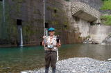 | 2日目の朝、パンとコーヒーで簡単に朝食を済ませて新潟へ向かう。今日は帰る日なので昼頃まで釣りをして帰路に着く予定である。国道8号線をひたすら走り、青海川へ到着した。デンカ沿いの道路には、山岳マラソンの垂れ幕が所々に掛かっている。入っても大丈夫かなと思いながら、いつもの入り口に到着した。 前回は水量が多くて釣りにならなかったが、今回、堰堤に降りてみると、逆に水量が全くない状態であり少しがっかりした。しかも、下流には一人竿を出しているのが見えた。 早速準備をして、竿を出すと、下で釣っていた人が顔を出したが、我々を見て戻って行ったようだ。 そして、直ぐに良型のイワナが掛かったので、生かし魚篭をザックから取り出して入れた。このあと、つかさくんも準備を終えて横で釣り始めた。最初に1〜2匹釣ったあと、抜こうとして、どうも身切れしたようでバラシたので、この後つかさくん は大物らしきアタリには慎重になり、引き抜くのを止めてしまった。私としては尺物でも是非、引き抜いて欲しかったのであるが。 そうこうしているうちに、生かし魚篭には10匹近くのイワナが泳いでいた。すると、上から監視員のおじさんが降りてきた。「どれ位のが釣れてるの?」と聞いてきたので、生かし魚篭を見せてあげました。小さい魚はリリースして欲しいと言われたので、「我々は持ち帰らないので全部リリースしてますよ。その為にこうして生かしてあるんです。」と教えてあげました。何でも、他県の人の魚篭を見たら10センチ程の魚も入っていたので注意したら、逆切れされたといって嘆いておられました。 そして、山岳マラソンがあるので駐車してある車の移動をお願いに来たとの事だったので、つかさくんが監視員の方の車に乗せてもらい、一旦戻りました。 |