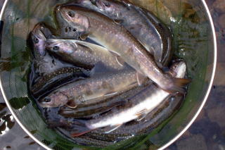 | 監視員の方と話している間、ポイントも休ませることが出来たので、この隙に、大物を釣って、つかさくんをビックリさせようと思い、再び竿を出すが、リリースサイズのチビイワナばっかりでした。 車を移動させたつかさんくんが戻って来て、再び竿を出すと、いきなり尺近いイワナを釣ってしまったのでビックリ。私は露払いをしといたからと、負け惜しみになってしまった。そして、この後、アタリも止まったし、時間も昼近くなったので、釣ったイワナ達の写真を撮ったあと、静かに流れに戻しました。 つかさくんは「次に来る時まで、誰にも釣られるなよ。」と言って、イワナの頭をこずいていた。イワナは何が起こったのか判らずにキョトンとして、すぐには立ち去らなかったが、しばらくするとゆっくりと泳いで行きました。(ナニスンネン) |