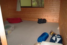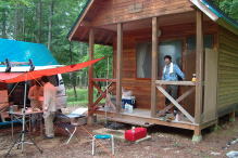 | 一色のキャンプ場には午後4時頃に到着した。既に何組もの家族連れや若者達が楽しく夕食の支度をしていた。我々も早速荷物を降ろしてバンガロー前でバーベキュウの準備を始めた。途中で買った飛騨牛や野菜をつまみにビールが進む。また、今回参加したK-ZO君も焼酎をグビグビ飲んでとても美味しそうだ。そして夕刻に仕事を終えた「桐やん」もやっと到着して、楽しい宴会が遅くまで続いたのでした。 |