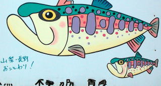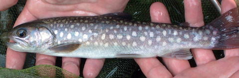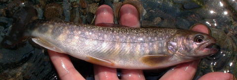 | さっそく、いつもの場所から川に降りて河原を歩くが、水量は全然ない。すぐに問題のV字谷と大岩が現れてきた。大岩の付近には淵もあり、好ポイントとなっているが、ここは帰りに竿を出すことにして取りあえずえん堤へ行ってみることにした。何とか大岩を乗り越えると川も緩やかになり、すぐにえん堤が見えてきた。道上から見た時はあまり判らなかったが、結構深いプールとなっており、早速交代で竿を出すことにした。 最初に私が竿を出すとすぐにアタリがあり、真っ黒なイワナが釣れてきた。サイズは17センチ程であったが、いつもこの川で釣れている「ニッコウイワナ」系とは全く違うイワナで、オレンジ色の斑点やパーマークは一切なくて白い斑点のみの、いわゆる「アメマス」系のイワナであった。この後、つかさくんと交代したが、やはりつかさくんにもアメマス系のイワナが釣れてきたのである。この地域に生息しているのかは不明であるが、戻ってから調査してみることにする。 だが、もっとビックリしたのはつかさくんの目印を目掛けて尺上のイワナが飛び出したことである。早速仕掛けをテンカラに代えたのは言うまでもない。 |