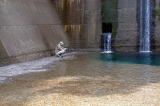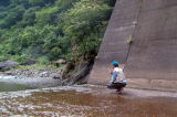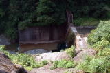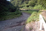 | アイサワ谷へ向かいやっと流れが見えてきた。水はここの取水えん堤で全て取られていたのである。だが、奥に進むと既に先行者が4人程いた。既に釣りの仕度は終わっているので、とりあえず朝食をして竿を出してみることにする。 歩きながらもつかさくんは、しきりにグローブの匂いを嗅いでいる。どうやら癖になってしまったようだ。しかも、新品のグローブを先日購入しているにも係わらず、それを使うこともせず、物々といっている。 入渓してすぐに対岸に親子が歩いていたので、釣れましたかと声を掛けたが、余り思わしくなかったようだ。えん堤の拾い釣りをしたが、チビイワナ2〜3匹に終わった。しかも途中でつかさくんがヘビに出会い、気力喪失となり下流への移動を余儀なくされたのでした。車に戻り、新品のグローブをつけたつかさくんは気力も復活、だが、前のグローブは何故か私の目の前のダッシュボード上に置かれたのでした。 下流へ戻る途中で道上からえん堤が見えたので上から覗くと何とか水のある場所を発見した。ここは以前行こうとしたが、水量が多くて川を渡れなかった場所であることが判明し、今回のこの状態なら行けるのではと、早速移動した。 |