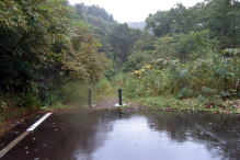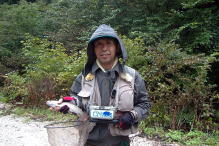 | 今回参加者の全員が勢ぞろいした9月21日、ひろくん一家は朝からカップラーメンを食べ、雨にも係わらず元気がよさそうである。また、親不知ピアパークでの野宿にもめげずに私にも気合が入る。 取りあえず、コンビニで朝食と昼食を購入して「田海川」へと向かった。前回に訪れた時は、セメント工場前の小えん堤でよく釣れたので、みんなにはそこで竿を出してもらい、私とつかさくんは上流へと向かった。 前回上流へ行った時は、道路が川と近づいた場所が源流らしき所であり、水量も少なかったので、そこで引き返してしまったのだが、地元の釣り師の「大ちゃん」の情報では、そのまま道沿いに登って行けばトンネルがあり、そこを越えるといいポイントがあるよとのことであったので、今回様子を見に行くことにした。 奥にセメント工場の砕石場があり、平日はダンプの往来があるので、日曜以外はとてもすれ違いの出来る幅の道路ではない。道路は整備されてはいるが、ヘアピンカーブが連続していて一気に高度を稼いでいる。途中で見えた青海の町の景色も素晴らしかったが、晴れていればもっと綺麗なのだろう。 そして、やがてトンネルが現れた。もちろん街灯などない真っ暗なトンネルだ。それを越えると再び道は坂が続き、途中で舗装も無くなり、長く続いた雨のせいなのか、かなり荒れている。ランクルでなければとても走破できないだろう。車の高度計を見るとすでに800m近くなっており、いかに急勾配なのかがよく判る。だが、谷はあるのだが川らしき物は一向に現れず、しばらく進むと道は再び舗装されており、セメント工場の砕石場も現れた。そして、峠らしき所に出た時、いきなり道路がなくなってしまったのであった。 |