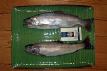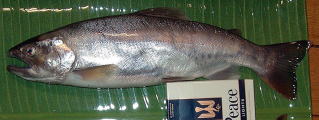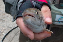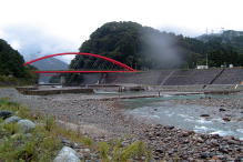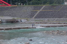 | この後、とっちんや武ちゃんも良型のイワナを釣った後、今度は大物のヤマメを釣るべく移動をした。 とっちんも私も以前に良型のヤマメを釣っているし、また、サクラマスが悠然と回遊をしていた川であったのだが、着いてみてビックリ。上流で工事をしているのと、大雨で大量の土砂が出たのであろうか、川の様子が変わっており、淵もかなり浅くなってしまていたのである。橋の上から覗いてみたが、魚影もあまりない。それでも、とっちんと、今回同行したとっちんの従兄弟の池田さんが竿を出して、塩焼きサイズのヤマメを釣り上げた。 その後、時間もお昼頃になったので富山に戻り、黒部川沿いにあるキャンプ場で昼食とした。その後、黒部川本流を釣ることにし、「愛本橋」下のえん堤へ向かった。 黒部川はかなり減水していて、えん堤の真ん中のブロックまで出ている。私とつかさくんは川横の道路で高見の見物をしながら昼寝とした。 見ていると武ちゃんが唐揚サイズのヤマメをたくさん釣っている。その横で池田さんもルアーで挑戦を始めた。そして、しばらくして、ひろくんが長竿を持って登場し釣り始めたが、何か釣り方がいつもと違った。普通の餌釣りなら、仕掛が自然と流すのであるが、ひろくんはその仕掛を川底をなめるように流していた。 (私とつかさくんは、何でだろう♪何でだろう♪と自然に合唱し始めたのであった) 歌い疲れて、ウトウトとしていると、つかさくんがいきなり、「でかいのを釣ってるぞ」と大声を出したので、飛び起きて川の方を見ると、丁度、池田さんが大物を取り込んだ所であった。ブロックの上から釣っていたので中々取り込めなかったようだ。後で様子を聞くと、少し離れた所で釣っていた武ちゃんに応援をたのんだが声が届かなかったようで、タモももっていなかったので最後はラインを手で持って、引き抜いたようであった。 |