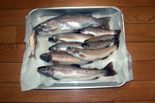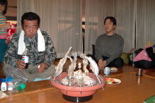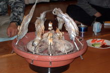 | この日も、イワナやヤマメの塩焼きや、イワナのねぎま。そして、とっちんの作る数々の料理に酒も進みました。 また、とっちんの従兄弟の池田さんは、話を聞くと渓流釣りを始めてから1〜2年程で、今回尺ヤマメも釣れて大満足と喜んでおられました。これで、どっぷりと我々の仲間に引きずりこまれてしまうのであろうか。しかも、仕事の関係で、現在は富山市内に住んで居られるとのことで、とても羨ましかった。食事後は明日も仕事とのことで、とっちんが富山市内まで送って行きましたが、今日一日、楽しんでもらうことが出来て、我々もとてもうれしかった。 さて宴会の方は、ビールや焼酎も空となり、みんなほろ酔い気分。ふと、武ちゃんを見ると姿がない、多分睡眠不足とアルコールでが効いたのか、先にお休みになられたようであった。 我々も、バンガロー内の風呂にゆっくりと浸かり、明日に備えて早めに眠りについたのであった。 |
