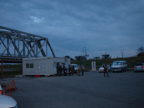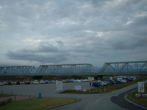 | 年寄りの朝は早い。 午前3時過ぎには我々は眼が覚めて、コンビニに行って朝食を仕入れる。武ちゃん達はまだ到着していないので、再び仮眠をとる。しばらくしてやっと武ちゃん達が到着したが、4時は過ぎていたと思う。そして、午前5時を過ぎる頃には着々と車が集まり始めた。受付は6時半からなのに既に管理棟の前に並ぶ人の列ができている。私はそれを見ながら、味噌汁を沸かして朝食を取った。 空は曇っているし風も強い、雨だけが心配である。早速に受付を済ませて、鉄橋上に行ってみるが、既に入る隙間もないので、鉄橋下へ別れて入った。 |