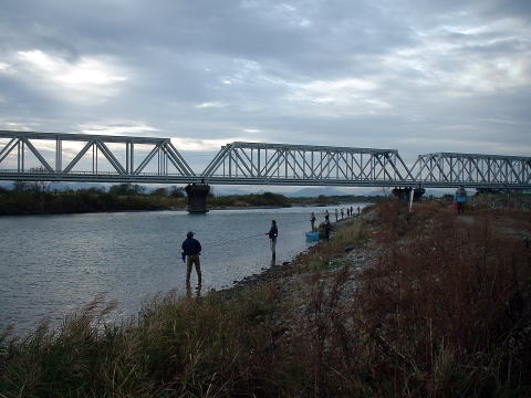 | 鉄橋下は比較的浅いので、遡上する鮭の背びれが時々見え隠れする。そんな中、私の第2投目に早くもサケがヒットしたのである。しかも目の前3メートル程の所であった。サケの頭が見えた時はちゃんと口にルアーが掛かっているのも確認でき、「さすがに手取川スペシャルスプーンだ、簡単につれるじゃん!」などと思いながら、引き寄せる。武ちゃんを大声で呼び、タモをお願いする。だが、掛かりが浅かったのだろうか、タモが到着する前にサケはお帰りになられました。(;_;) 余りにも簡単に一匹目が掛かったので、今日は楽勝じゃん等と思い、気を抜いてしまい、しっかりと合わせをしなかったのが原因と思われるが、武ちゃんと二人で、最初で最後のアタリだったりして・・などと冗談を言っていたのだが、まさかこの言葉が現実になろうとはこの時点では知る術もなかったのである・・・。 その直後、隣で釣っていたルアーマンにヒットした。その人はちゃんとタモに収めて見事なオスを釣り上げ喜んでいた。だが、写真を撮っている時に、サケが逃げ出して、流れの中にジャバジャバと戻って行くではないか。しかもルアーは口にまだ掛かっており、ロッドもカラカラと音を立てて引きずられて行った。慌てたそのルアーマンは川の中まで追いかけて、なんとかロッドを捕まえる事が出来、事なきをえた。 周りの人は大笑いで、どうせなら、ロッド事「サヨナラ」して欲しかったなあ等と仲間の人に言われていた。とっちんもそれを見てから、笑いすぎて調子が狂ったとぼやいていた。 |