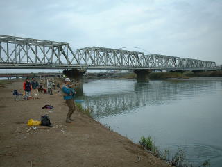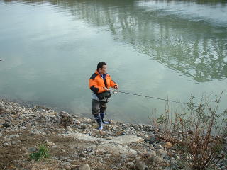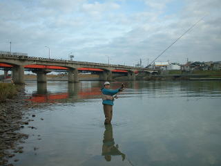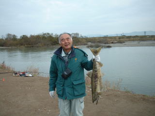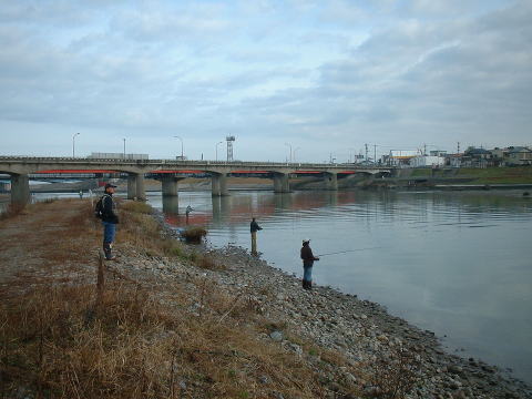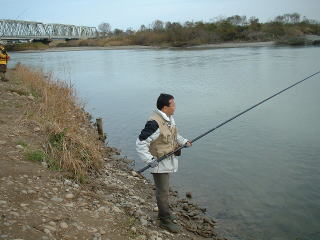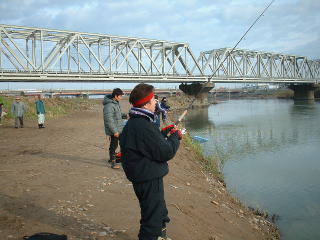 | 【今回の釣果】 参加者:とっちん、とっちんぱぱ、ひろくん、武ちゃん、ゆたかくん、桐やん、倉田さん、 ひろくんの同僚2名、とっちんの親戚3名、隊長、の合計13名 日時: 2003年11月24日(月) 天気: 晴れのち曇り 気温15度 場所: 石川県 手取川 釣果: 桐やん 1匹、とっちんのおじさん 1匹 |