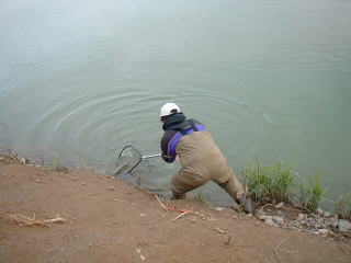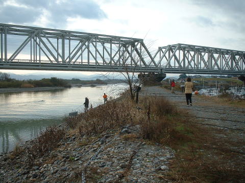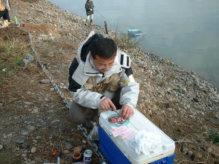 | しばらく、上流で粘ってたが他の人たちが来ないので、様子を見に戻るとまだ仕掛の作成中であった。その後、前回唯一ヒットした下流へ移動したが、水量も少なめで釣り人もまばら状態、しばらくルアーで攻めるが全くアタリなし。ひろくんも餌釣りで挑戦しているが、思わしくないようだ。 |