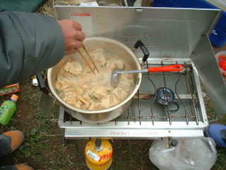 | 私も、ひろくんから竿を借りて餌釣りに挑戦してみあたが、全くアタリもなくて早々に諦め、早くも缶ビールを飲んで休憩となったのであった。 そうこうしているうちに、とっちんの親戚の方3名も到着して13名が揃ったのであるが、「どうだ、釣れとるか」との問いには誰も答えることは無かった。そして、最上流でやっと一匹掛かったようだが、小振りの鮭であった。 余りにも釣れずに、昼頃になってしまい、河原で昼食の用意を始めた。今回は人数も多いのでとっちん達は煮込みラーメンの用意をしてきてくれた。 |
