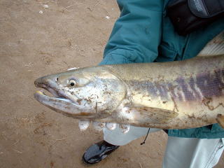 | さあ、食べようと思った時に、桐やんを見るとロッドがしなっているではないか。始めはまた根係りかと、誰も信用しなかったのだが、鮭の顔が見えたのでさっそく取り込みに向かいました。 初めてのヒットで桐やんも少し興奮ぎみ、倉田さんがなんとかタモに収めて一同拍手喝采であった。だが、メスだったので生簀行きとなったのでした。実は下の写真以外に両手で鮭を持つ桐やんがニッコリと微笑んだ写真がのるはずだったのだが、ちょうどデジカメの電池切れとなってしまいました。(桐やんゴメンナサイ) |
