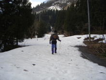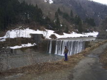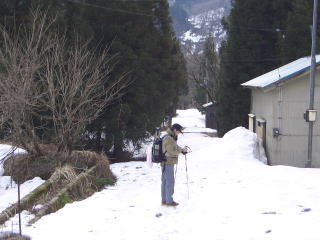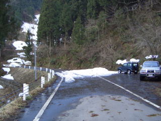 | 昨年よりも一週間遅れての幕開けとなる2004年の渓流釣りも、また新潟からのスタートである。 3月26日(金)は午前中に仕事を切り上げて、午後5時前に「つかさくん家」に到着した。 3月8日には先発隊でとっちん達が富山へ遠征をしたが、雪と渇水で玉砕となったようだが、その二の舞は踏まないようにと二人共、気合だけは十分である。 このところの温かさで、富山・新潟地方の雪も少しは溶けたとは思うが、昨年は溶け出した雪で帰り道で大変な思いをしたので、今回は安物ではあるが「かんじき」を購入しており準備は万端だ。 国道156号線を北上し、郡上八幡でエサのヒラタを購入し、「せせらぎ街道」に入ると周りは雪景色と変わってきた。よく見ると道路脇に積もっている雪は新雪のようで直前まで降っていたようだ。そして標高が上がるにつれてやがて雪が降り出した。峠近くではマイナス3度まで気温が下がっていた。とっちん達が来た時は「−13度」だったらしいが、想像できない寒さである。 高山市内に入ると雪もなくて、そろそろ夕食をとろうと店を探したが、どこもすでに閉まっており、先に買っておいたパンとコーヒーで我慢し、富山市内でなんとか夕食にありつけた。その後、高速で「親不知インター」まで向かい、道の駅で仮眠をとった。 翌朝5時半、コンビニで朝食と昼食を仕入れて、青海川へと向かう。 道路から見える青海の山はまだ雪で真っ白で、どこまで車で入れるのだろうかと川沿いの道を進む。所々に釣り人らしい車も止まっており、水量も渇水とまではいかない程度にある。 発電所の分かれ道から上って行くと昨年と同じ場所に通行止めの看板があるが、車一台分のスペースが開いていたので、行ける所まで行ってみよまいという事で上っていった。そして先行者らしき人の車を発見した所からは雪が深くなっていたので広場を見つけて駐車し、そこから歩くことにしたが、昨年は2キロ程歩いたがその半分以上は車で入ることができた。さっそく朝食をとり、遡行の準備をした。 |
