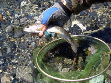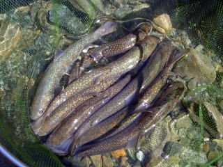 | しばらく休憩した後、つかさくんは下流で竿を出し、私はえん堤で粘っていた。 すると下流で竿を出していたつかさくんに良型のイワナが釣れてきたので、私も下流へ移動することにした。その下流の落ち込みは昨年と違って適度な水量はあるが、水は澄み切っており魚からはこちらが丸見えになっているので少し釣り難いが、落ち込みの上から竿を出して見た。 そして、私に良型のイワナが3匹程釣れたのであった。また、つかさくんは少し下のポイントでバラシたようで、その後も粘っていた。 |