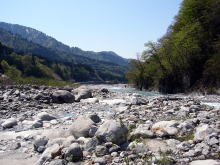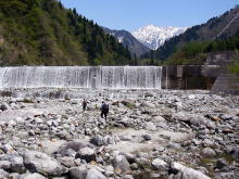 | 小早月川から、早月川の本流へ行ってみることにした。山菜取りの車はあちこちで見かけるが、釣り人は全くと言って良いほど見当たらない。 昔、富山に渓流釣りに来はじめた頃は、いつもこの「早月川」に来ていた。この川は「剣岳」に端を発し、「黒部川」「常願寺川」と並ぶ、富山の暴れ川の一つである。上流の馬場島地区は剣岳の登山口になっており、キャンプ場やバンガローもあり、そこで泊まってよく釣りをした。釣れるイワナも型が揃っており、時折、良型ヤマメも混じっていた。だが、暴れ川の宿命なのか、来る度に砂防えん堤が増えており、今もあちこちで工事が行われている。各えん堤には道路までついており、簡単に車で降りられるので魚もあっという間にいなくなってしまった。残念ながら私もその原因をつくってしまった一人なのかも知れない。 久しぶりに河原に立ち、竿を出して見たが、やはり魚の気配が無い。ここにはもう魚がいないという先入観なのか、振り込む竿に力が全く入らない。どこまでも澄みきった流れをただぼんやり眺めるだけであった。 |