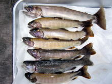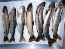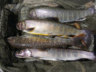 | 少し下流で釣っていたとっちんがアタリがあったといっていた。私はえん堤の落ち込みで竿を出してみるが流れも強くて、中々ポイントに仕掛けが入らない。又、根係りも多くて苦労した。そして武ちゃんが、右側の少し流れが緩い場所で粘っていたので、私も横に並んで仲良く竿を出させてもらった。 しばらくすると、何と私に良型のイワナが釣れてきたではありませんか!!。全くいないと思っていたのでこれにはビックリ。しかも、横の武ちゃんにも同じサイズが来た。そして、少し粘ると二人にもう一匹ずつ釣れたのであった。何というか久しぶりに早月川のイワナをみる事ができて一人感動に咽ぶ私であった。 |