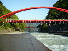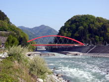 | 感動の早月川をあとにした我々は、黒部に向かい、いつものスーパー「パルフェ」で夕食の買出しをした。鮮魚のコーナーでは楽しみにしていた「ホタルイカ」の刺身が無かったので店員に尋ねると、今日は漁が思わしくなくて入荷しなかったとのことでガックリした。 一旦、常宿の「どやまらんど」にチェックインし、荷物を降ろした後、黒部川の横でカップラーメンを食べ遅い昼食とした。 「愛本橋」にはたくさんの鯉のぼりが宙を泳いでおり、春の日差しに眩しいほどである。それに相反するように、立山連峰の雪代と前日までの雨を一手に引き受けたような「黒部川」の流れは濁流となって富山湾にながれこんでいるのであった。 この愛本橋の左岸側で少し竿を出してみた。最初に武ちゃんが小振りなヤマメを釣った。私にはウグイが幾つか釣れた。少し我慢と言い聞かせて釣っていると、何と銀鱗も眩しい魚が私の竿を曲げたのだ。無理やりえん堤の上に引き抜いて、すわ、サクラマスだ。と、とっちんと武ちゃんに見せると「ただのニジマスじゃん」と言われた。おかしいなあ、私にはサクラマスに見えたんだけどなあ。確かにサイズは20cmにも届いていなかったが・・・。 そんな、こんなで今日の釣りはここまでとしました。 |