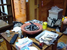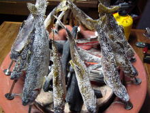 | 宿に戻り、夕食の支度をし、岩魚の塩焼きが出来上がる前に、「明日山荘」の温泉で今日の疲れを癒した。 そして、その後、こんがりと焼け上がったイワナの塩焼きをつまみにビールを一気飲みする武ちゃんを見ていると、とても気持ち良さそうであった。 そして、メインはとっちん特製の山菜入り煮込みどうんでお腹も満腹状態になりました。また、その夜、つかさくんから電話が入り、夕方に愛本橋の監視カメラに映っていたと言っていた。ほんとうに今回一緒に来られなかったのが残念である。明日の釣りを夢にふとんに潜り込んだのでした。 |