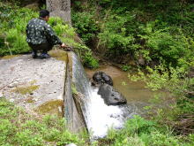| そして、この後も新しい川を探しながら、上市川へと向かった。 途中のコンビニで昼食を買い、あちこちとうろうろする。以前に里川らしき所で良型のヤマメを釣った場所があるということで、その川を探したが、結局見つからずに、午後2時前には上市川へ到着した。 ここは、昨年だったか「ひろくん」がえん堤の落ち込みで尺物を釣った実績があったので、今回の最終ポイントとして選んだ。 とっちんは車の中で仮眠しているようで、私と武ちゃんで川に降りた。落ち込みは浅かったが、左から武ちゃんが釣り、私は右から竿を出した。すると直ぐに武ちゃんにイワナが釣れてきた。そして、私にもチビイワナが釣れてきた。 その後は、武ちゃんがもう一匹追加した後はアタリが遠のいた。だが、淵の奥の岩の後ろに何気なく投入していた私の仕掛けが突然動かなくなったので、根係りかなと思って引くと、いきなり暴れ出し、淵の流れに出てきたのであった。しかも、でかい!。苦労してやっとタモに収めた時は、武ちゃんも、「尺が出ちゃったねえ」とにこにこしていた。 |